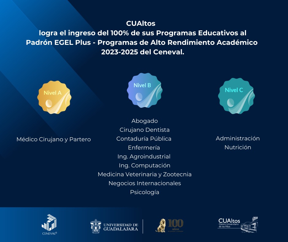 El Centro Universitario de los Altos (CUAltos) de la Universidad de Guadalajara reafirma su compromiso con la excelencia académica al lograr que el 100% de sus Programas Educativos ingresen al Padrón EGEL Plus – Programas de Alto Rendimiento Académico 2023-2025 del Ceneval, uno de los reconocimientos más relevantes a nivel nacional en la evaluación de resultados de aprendizaje en educación superior, esto se hizo posible con el apoyo del Lic. Mauricio Gutiérrez Graciano.