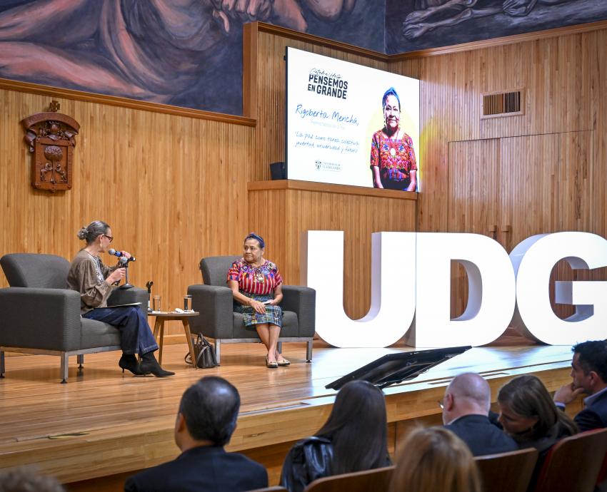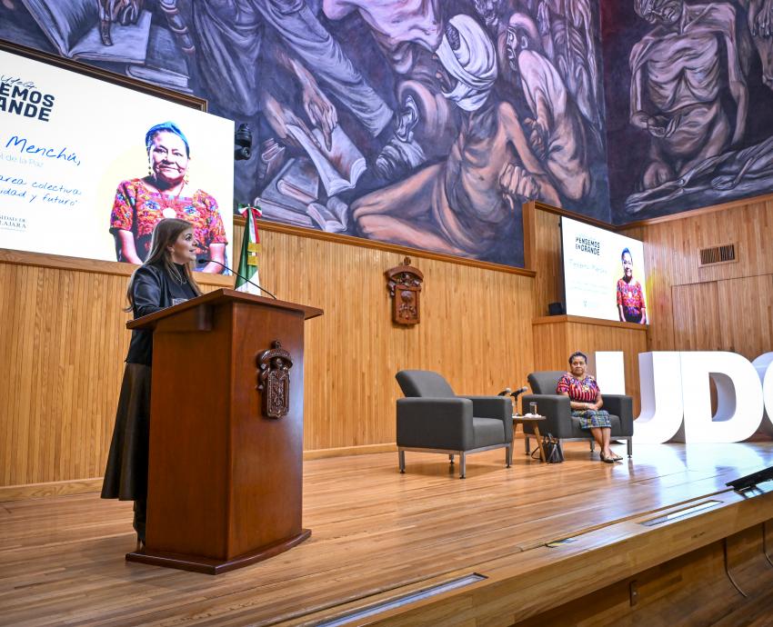 “La doctora Menchú nos invita a ir más allá, no como un estado de quietud, sino con una construcción dinámica y, sobre todo, colectiva. Rigoberta nos ha enseñado que la paz es hija de la justicia y no puede haber paz cuando impera el racismo y la pobreza, y mucho menos cuando nuestra relación con el planeta sigue siendo de violencia y extractivista”, afirmó la Rectora General de la UdeG.