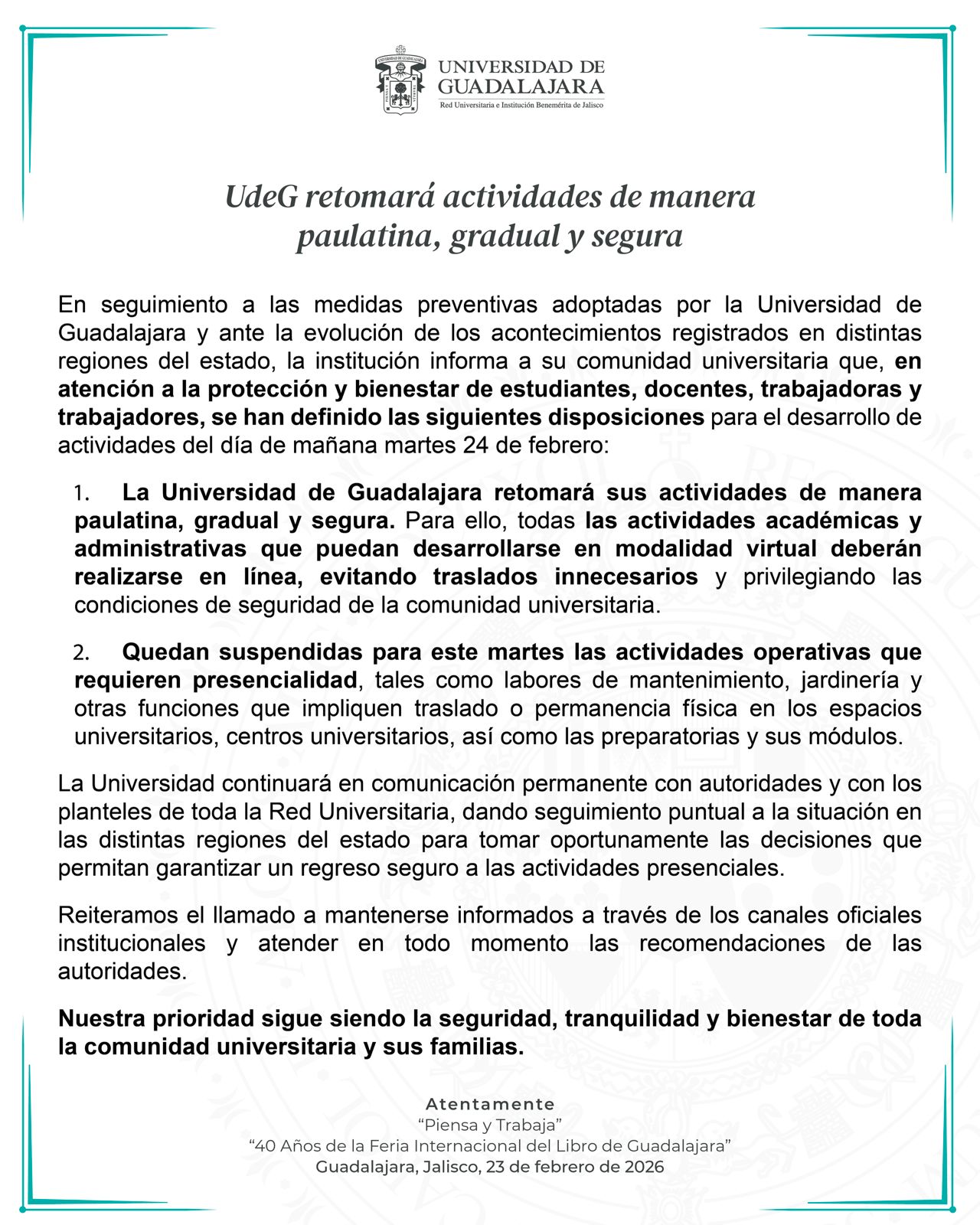 En seguimiento a las medidas preventivas adoptadas por la Universidad de Guadalajara y ante la evolución de los acontecimientos registrados en distintas regiones del estado, la institución informa a su comunidad universitaria que, en atención a la protección y bienestar de estudiantes, docentes, trabajadoras y trabajadores, se han definido las siguientes disposiciones para el desarrollo de actividades del día de mañana martes 24 de febrero:
